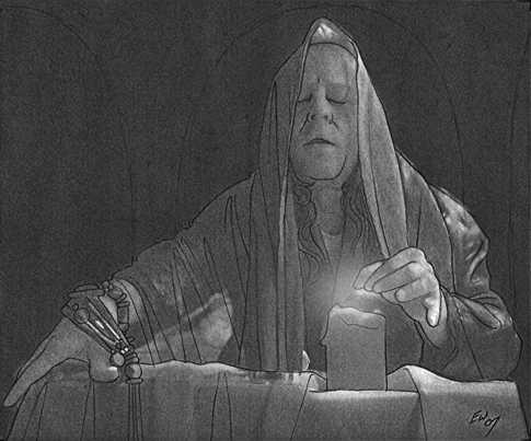 Description: Named character from the books. A middle aged woman with slightly greying hair, she is stern, practical, and matronly. She is dressed in black and lighting a candle in a dark chapel.
